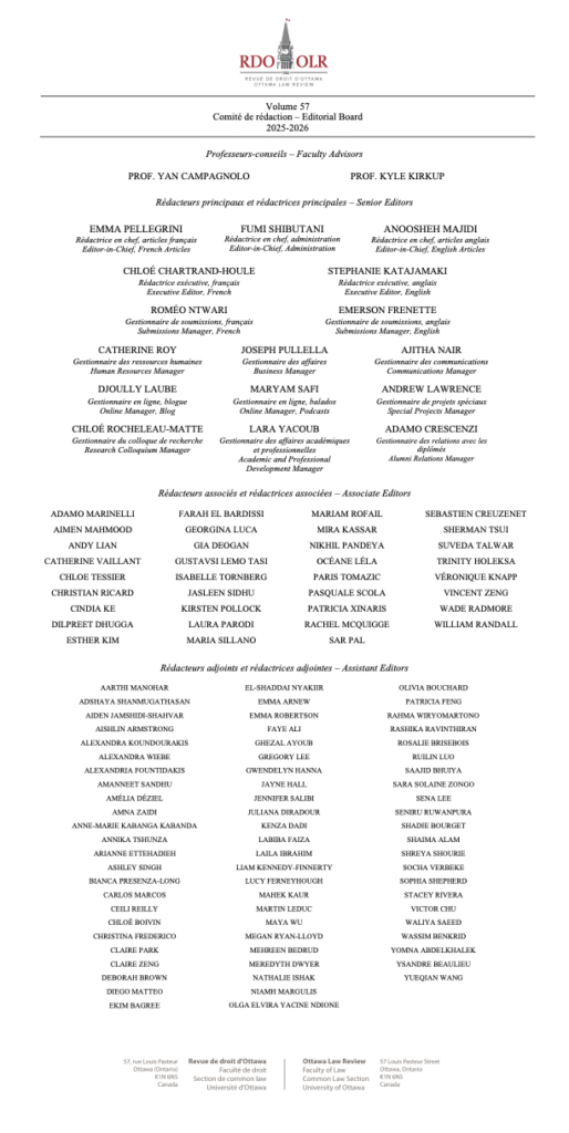 La Revue de droit d’Ottawa est reconnaissante des conseils et de l’aide fournis par nos professeurs-conseils, Kyle Kirkup et Yan Campagnolo.