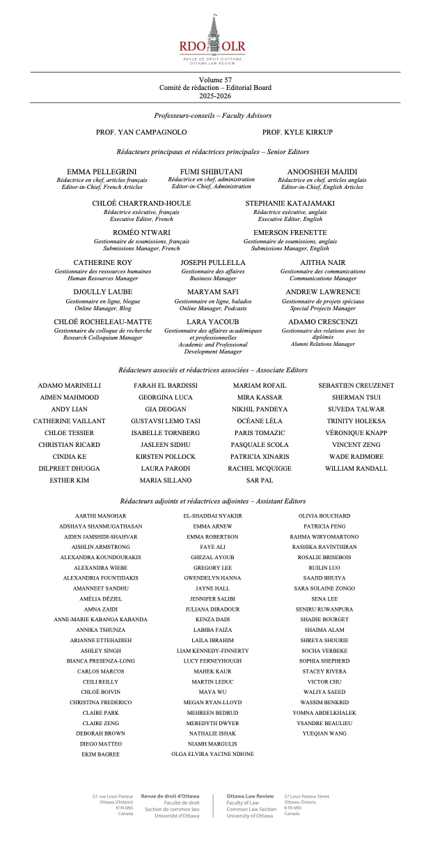 The Ottawa Law Review is thankful for the guidance and assistance provided by our faculty advisors Professors Kyle Kirkup and Yan Campagnolo.
